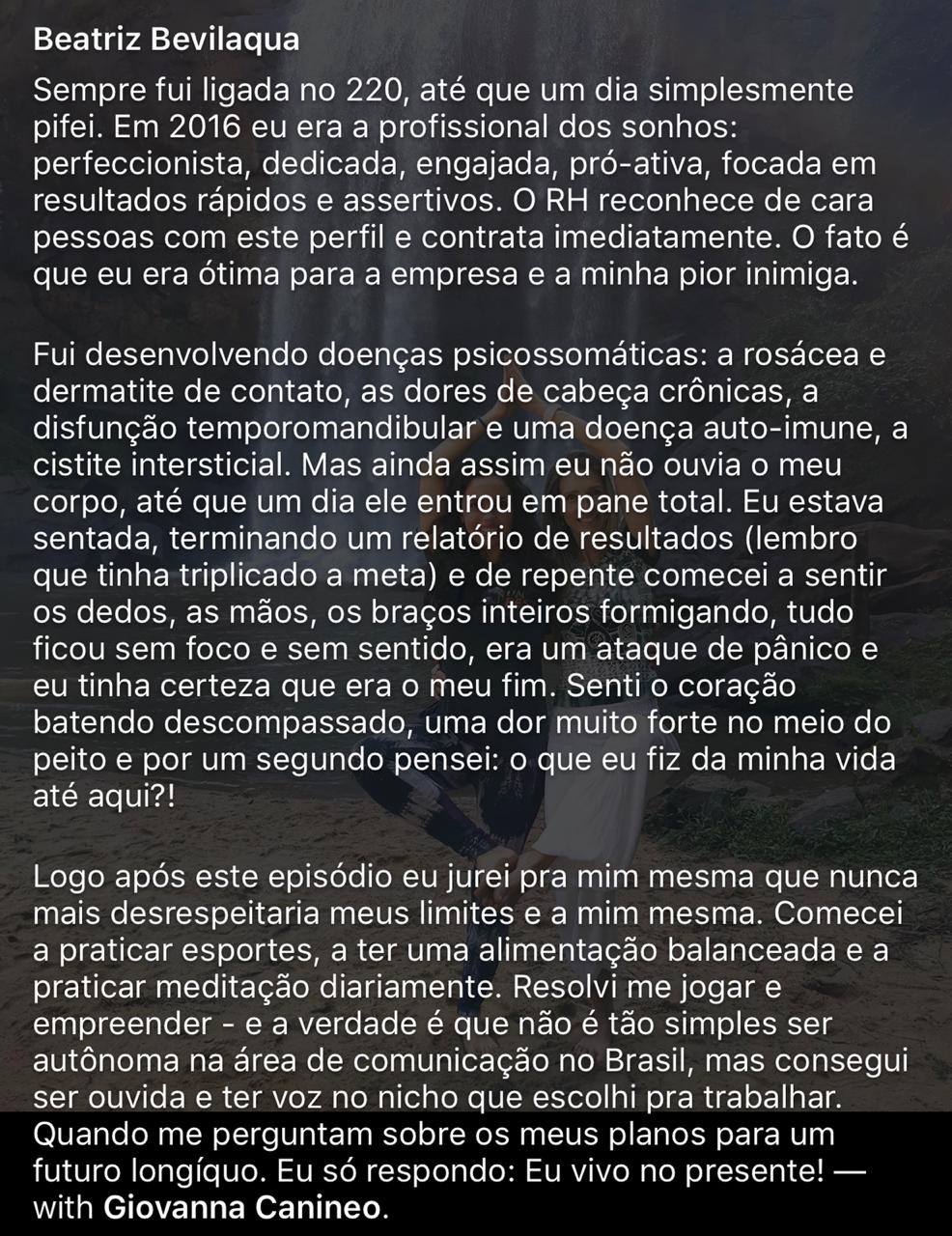 A jornalista Beatriz Bevilaqua vai compartilhar sua história, de como ultrapassar seus limites, a fez buscar um novo significado para sua vida e um novo ritmo sobre seu trabalho. Sua matéria para o Startse sobre burnout nas Startups, teve tantos acessos, que o site do Startse saiu do ar.