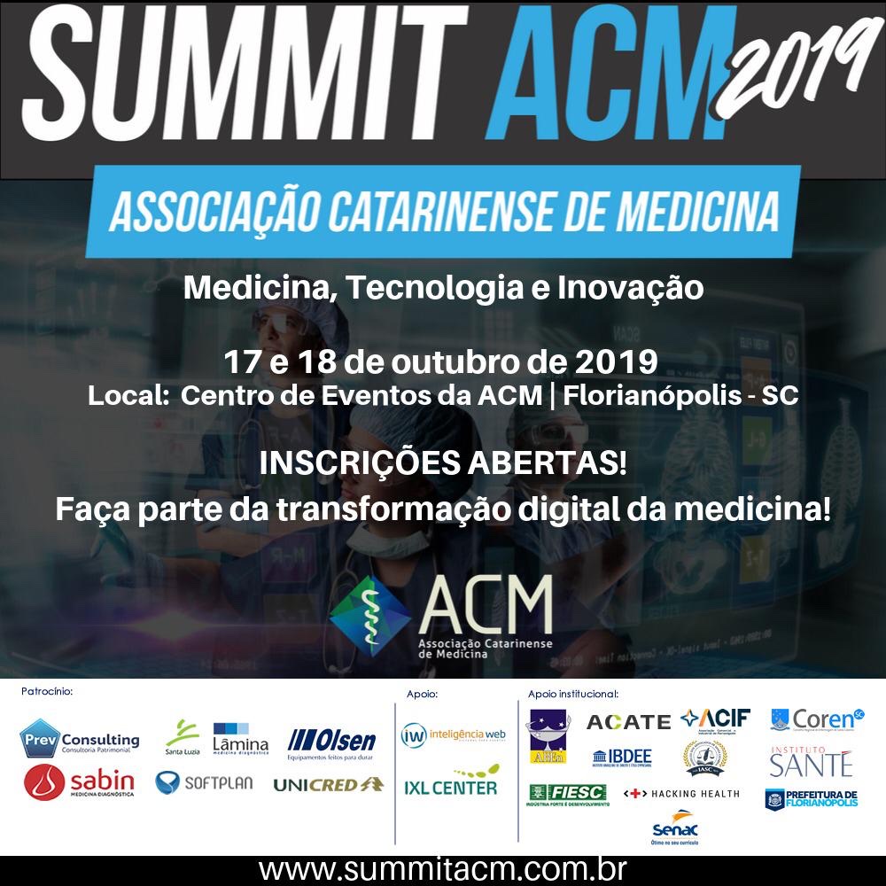 Nos dias 17 e 18 de Outubro de 2019, acontecera em Florianopolis 🇧🇷, Terra da Inovacao, o Summit ACM 2019, organizado pela Associacao Catarinense de Medicina, que trara palestrantes nacionais e 🌎, a fim de debater relevantes temas, em gestao e inovacao, em saude.