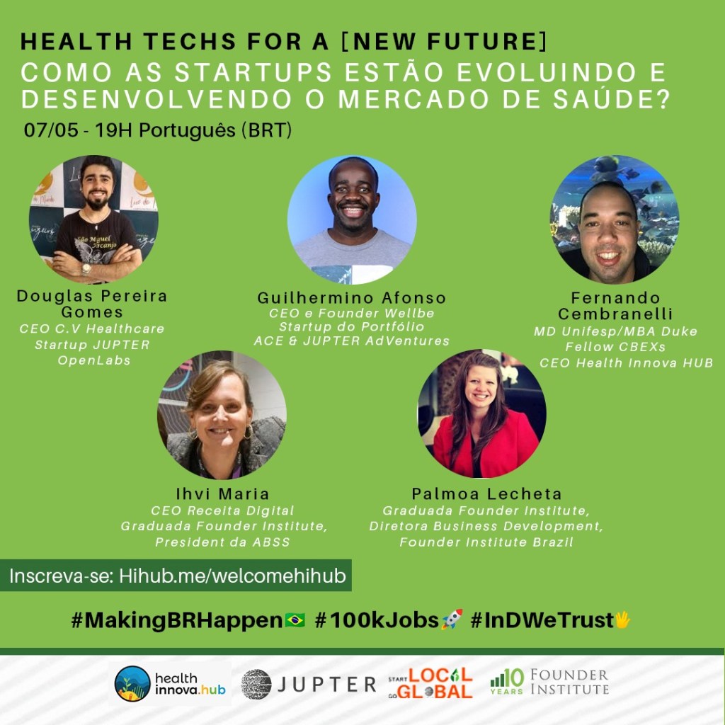 Health Innova HUB , JUPTER e Founder Institute Brazil convidam você para: Startups for a [NEW] Future: Como Health Techs estão evoluindo e desenvolvendo o mercado de saúde?