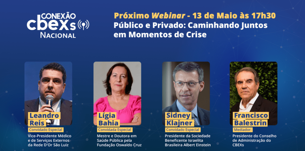 Parabéns Francisco Balestrin e Larissa Elói pela Liderança do CBEXs. Webinar Imperdível com Leandro Reis Tavares, Professora de UFRJ Lígia Bahia, e Sidney Klajner, Presidente da Sociedade Beneficente Israelita Brasileira Albert Einstein.