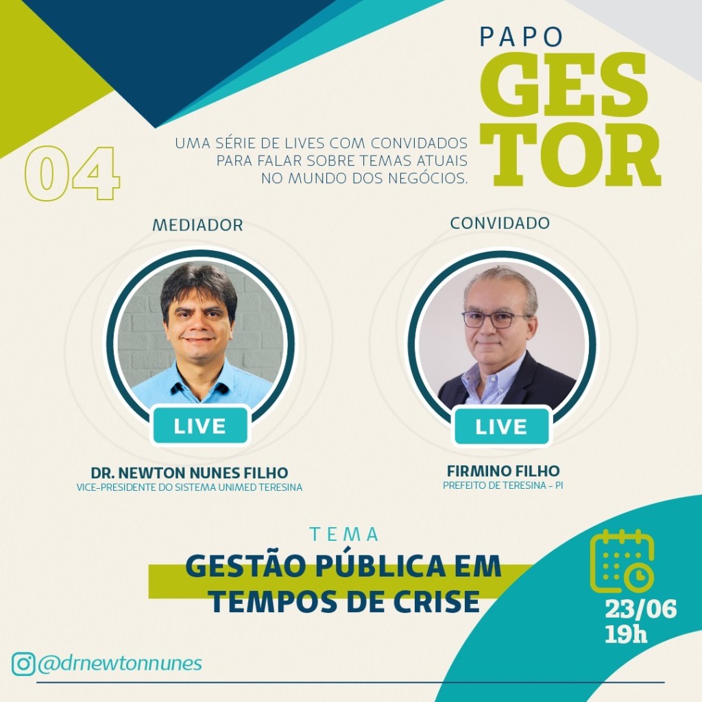 Hoje, às 19h, o quarto episódio do Papo Gestor traz uma live com o Dr Newton Nunes, vice-presidente da Unimed Teresina e o prefeito da Capital do Piauí, Firmino Filho. Tema : Gestão Pública em Tempos de Crise. Será no instagram @drnewtonnunes.