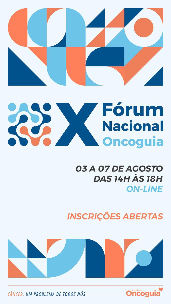 Você é nosso convidado para participar do X Fórum Nacional Oncoguia. Neste ano o evento será 100% on-line e acontecerá de 3 a 7 de agosto. As inscrições são gratuitas e as vagas limitadas. Garanta a sua!