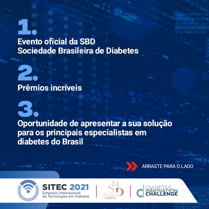 Parte do SITEC 2021, esta é uma iniciativa da SBD (Sociedade Brasileira de Diabetes) em parceria com o Design Thinking Lab (DTlab), que tem como objetivo fomentar a inovação, o talento, a criatividade e o senso empreendedor no desenvolvimento de startups que tenham como proposta de valor melhorar a qualidade de vida e gerar experiências memoráveis para pessoas com diabetes.