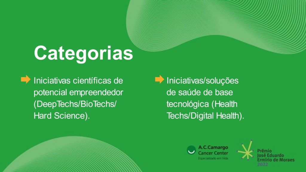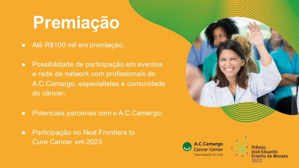 Os vencedores poderão ganhar até R$ 100 mil em premiação, potenciais parcerias com o A.C.Camargo Cancer Center e visibilidade com especialistas e comundade de oncologia.