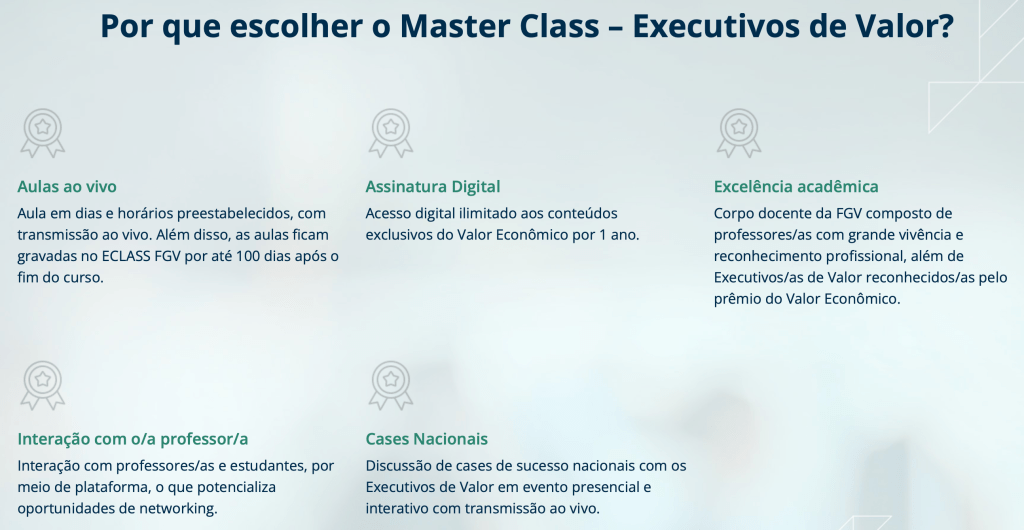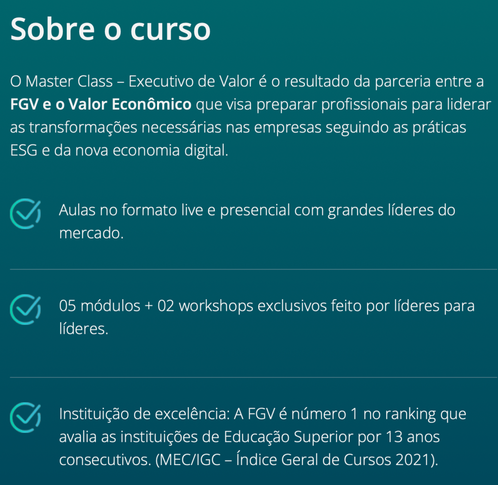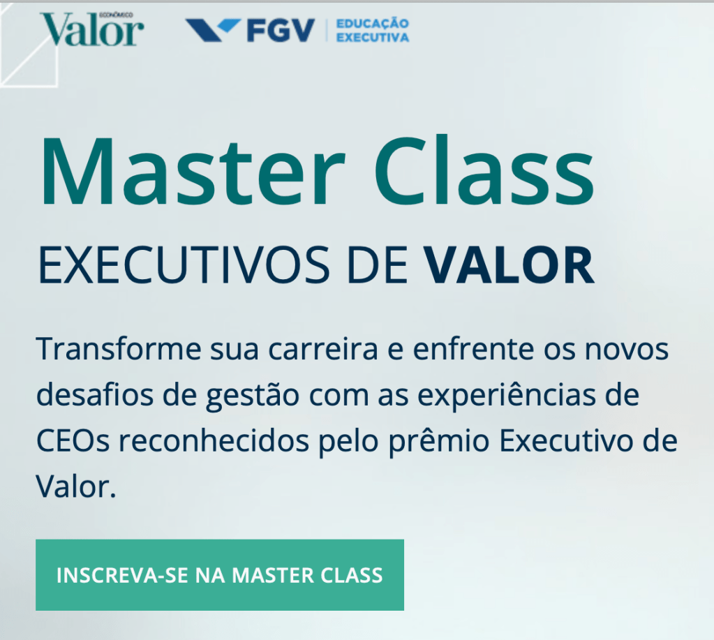Uma imersão na realidade empresarial com a profundidade acadêmica da Fundação Getulio Vargas, o dinamismo das informações do Valor Econômico e a expertise de CEOs premiados.