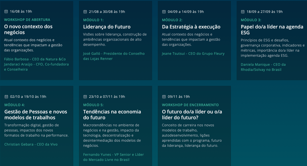 Curso com aulas ao vivo, via Zoom, que serão gravadas e disponibilizadas para que você possa rever. Os encontros com os Executivos serão presenciais em São Paulo e transmitidos ao vivo pelo Zoom.