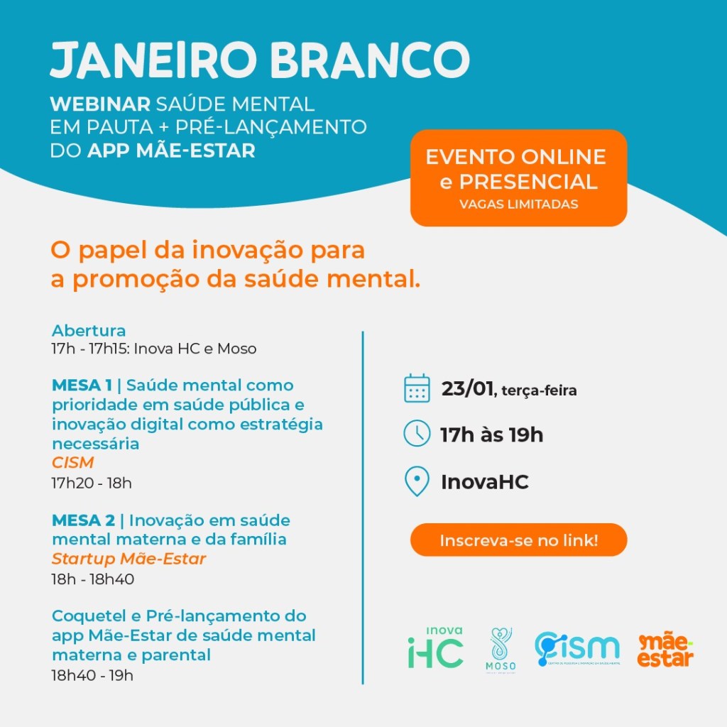 Inscreva-se para participar (Presencial ou Digital) https://www.eventbrite.com/e/webinar-janeiro-branco-o-papel-da-inovacao-para-promocao-da-saude-mental-tickets-800027452647