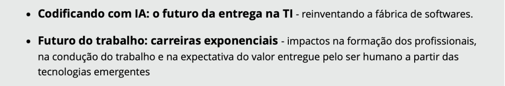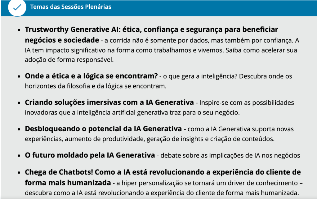 Descubra os impactos, os avanços, os riscos e as oportunidades que a IA generativa pode trazer para negócios e sociedade – um evento com muito conteúdo e interação dedicados a explorar tendências, insights e soluções. O encontro traz perspectivas em quatro pilares: tecnologia, negócios, ética e pessoas.