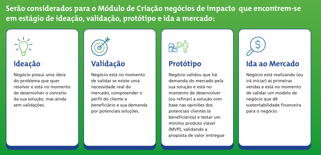 - Acompanhamento individual com especialistas em soluções de impacto;