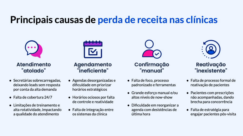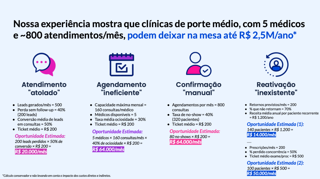 Atendemos clínicas e consultórios de todos os setores que desejam reduzir custos e otimizar operações, beneficiando especialmente aquelas com grande base de pacientes antigos. Especialidades com alta demanda por exames e procedimentos, como oftalmologia, ortopedia e dermatologia, têm maior impacto no aumento de receitas, mas nossa solução é aplicável e eficaz para qualquer clínica que queira transformar desperdícios em oportunidades.