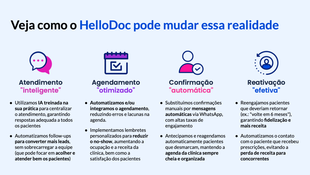 Na saúde, captar novos pacientes pode custar até 7 vezes mais do que reativar quem já confia na clínica. O HelloDoc reativa pacientes antigos, recupera receitas perdidas e automatiza tarefas, desafogando secretárias e otimizando a operação para que médicos e equipes foquem no cuidado e em melhores resultados.