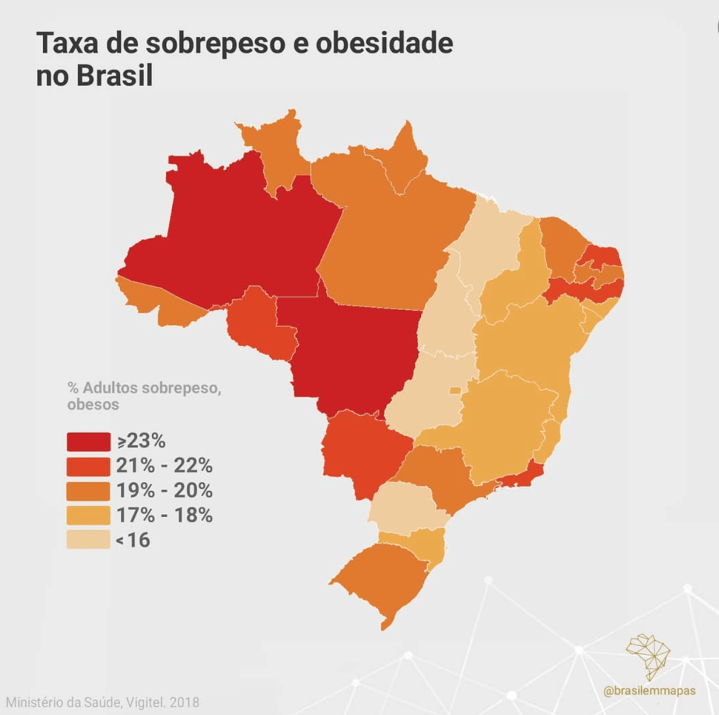 O documento da Federação Mundial da Obesidade (World Obesity Federation, WOF) revela que 68% dos adultos no País têm Índice de Massa Corporal (IMC) acima de 25 kg/m². Isso quer dizer que quase sete em cada dez brasileiros estão acima do peso normal e podem ser classificados com sobrepeso (IMC de 25 a 29,9), obesidade grau I (IMC entre 30 e 34,9) ou obesidade grau II (IMC acima de 35) pela definição anterior da doença — um grupo de cientistas atualizou o conceito recentemente, englobando outros critérios além do índice.