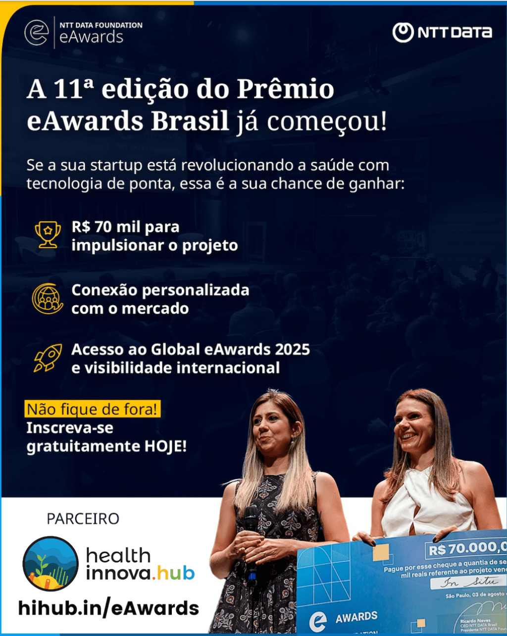 O vencedor do eAwards Brasil receberá R$ 70.000,00 em premiação, além de mentoria especializada da NTT DATA Brasil para auxiliar no desenvolvimento do negócio.