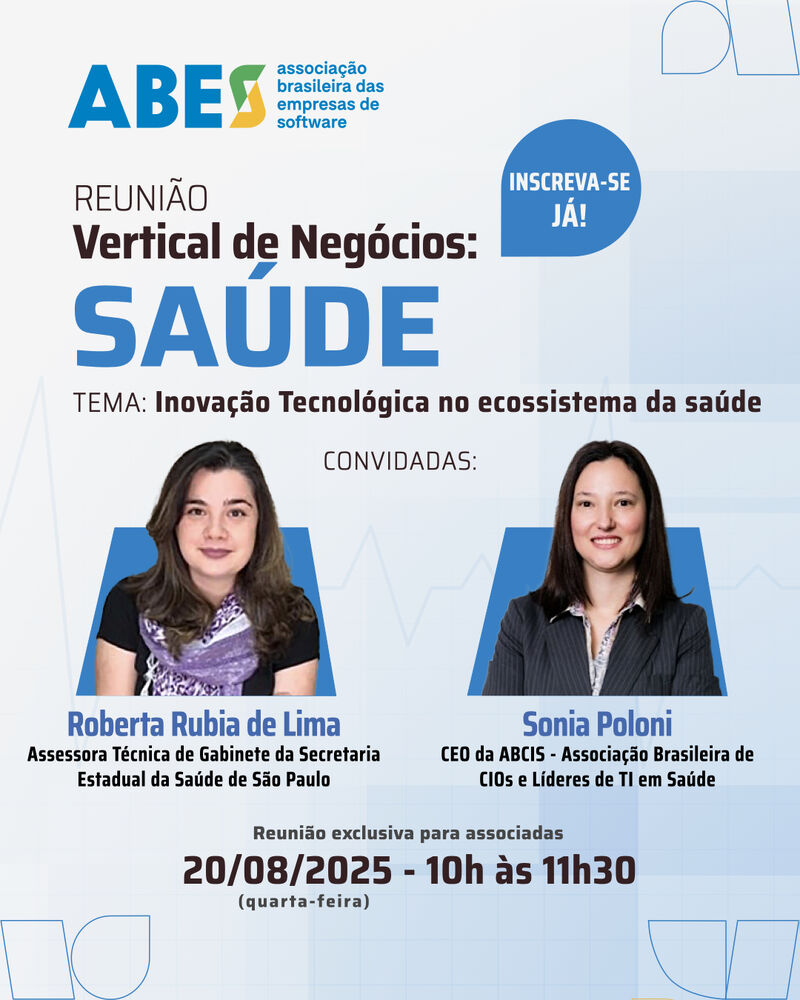 A Vertical de Saúde da ABES, liderada por Jamile Sabatini Marques, PhD, PhD e Fernando Cembranelli, CEO HIHUB.TECH🌎Health Innovation♾️Leaders🧬 convida todas as Empresas Associadas à ABES – Associação Brasileira das Empresas de Software, a participarem de mais uma reunião estratégica.