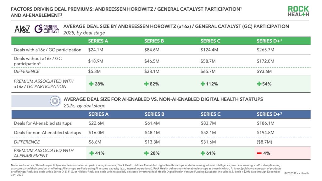 As empresas de saúde digital habilitadas para IA captaram 54% do financiamento total (um aumento em relação aos 37% do ano passado) e obtiveram um prêmio de aproximadamente 19% no tamanho médio dos negócios em comparação com empresas que não centram explicitamente a IA em seus produtos e serviços. Isso foi mais pronunciado na Série C, onde as startups obtiveram um “prêmio de IA” de 61%.